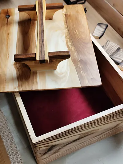 Medium-sized box made from a mix of different hardwoods, with a satin bottom inlay.