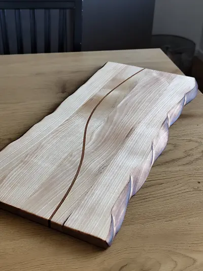 Serving tray made from birch. Features carved and burnt edges and an inlay of cherry.